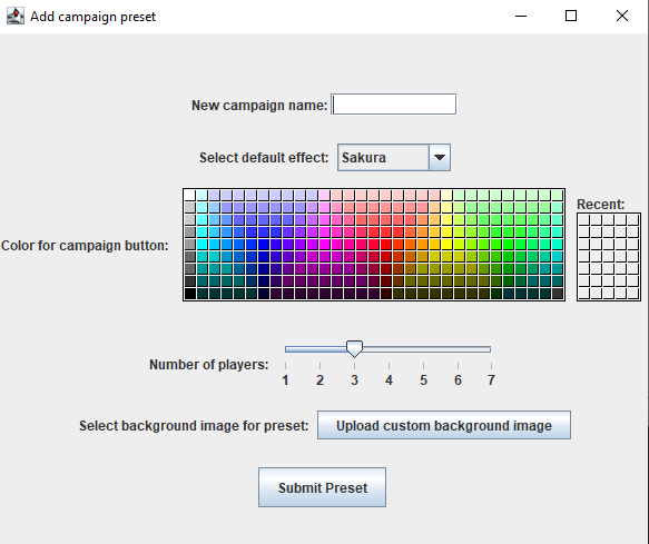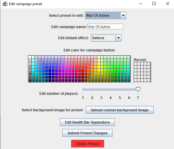 We’ve added the ability to add and edit campaign presets to our LED control software! Creating a campaign preset will add a campaign button to the graphical user interface (GUI) that you can click to load your preset. The button will display the name of the campaign and will be a color that you select. Each preset will save the number of players, the default LED animation that will be triggered when you click your campaign button, the location and length of each player’s health bar, and the custom background image for the GUI, if you choose to add one.